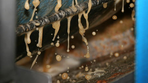 Die kleinen Apfelschnipsel werden zwischen zwei Bändern gepresst und der Saft läuft ab. Übrig bleibt der sogenannte Trester mit Apfelkernen und der Schale. Dieser fühlt sich sehr trocken an und wird von uns als Kompost für unsere Weinberge verwendet. Der Saft muss vor dem Abfüllen noch gefiltert werden, damit er blank wird.